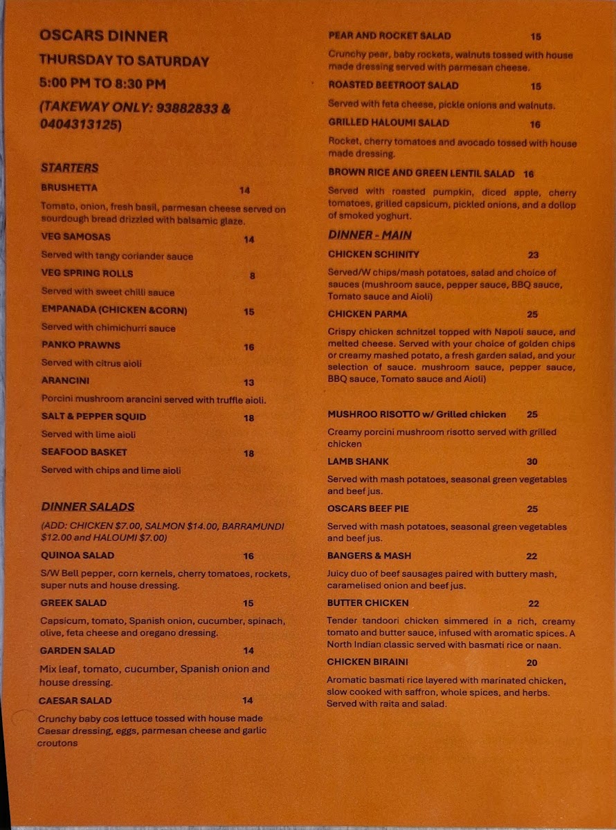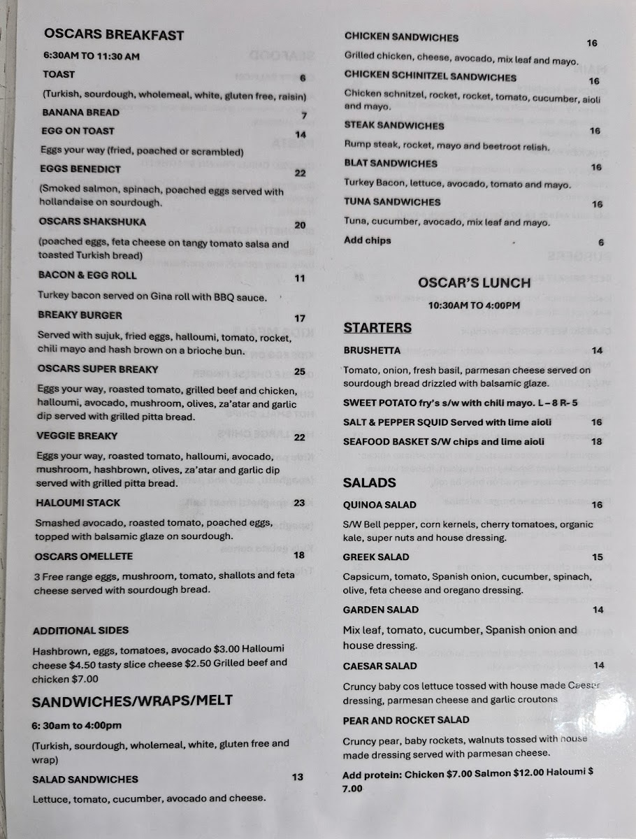 - Breakfast Delights: Start your day with the Oscars Super Breaky or indulge in the vibrant Shakshuka. Don’t miss the Breaky Burger, a delightful twist on a classic.